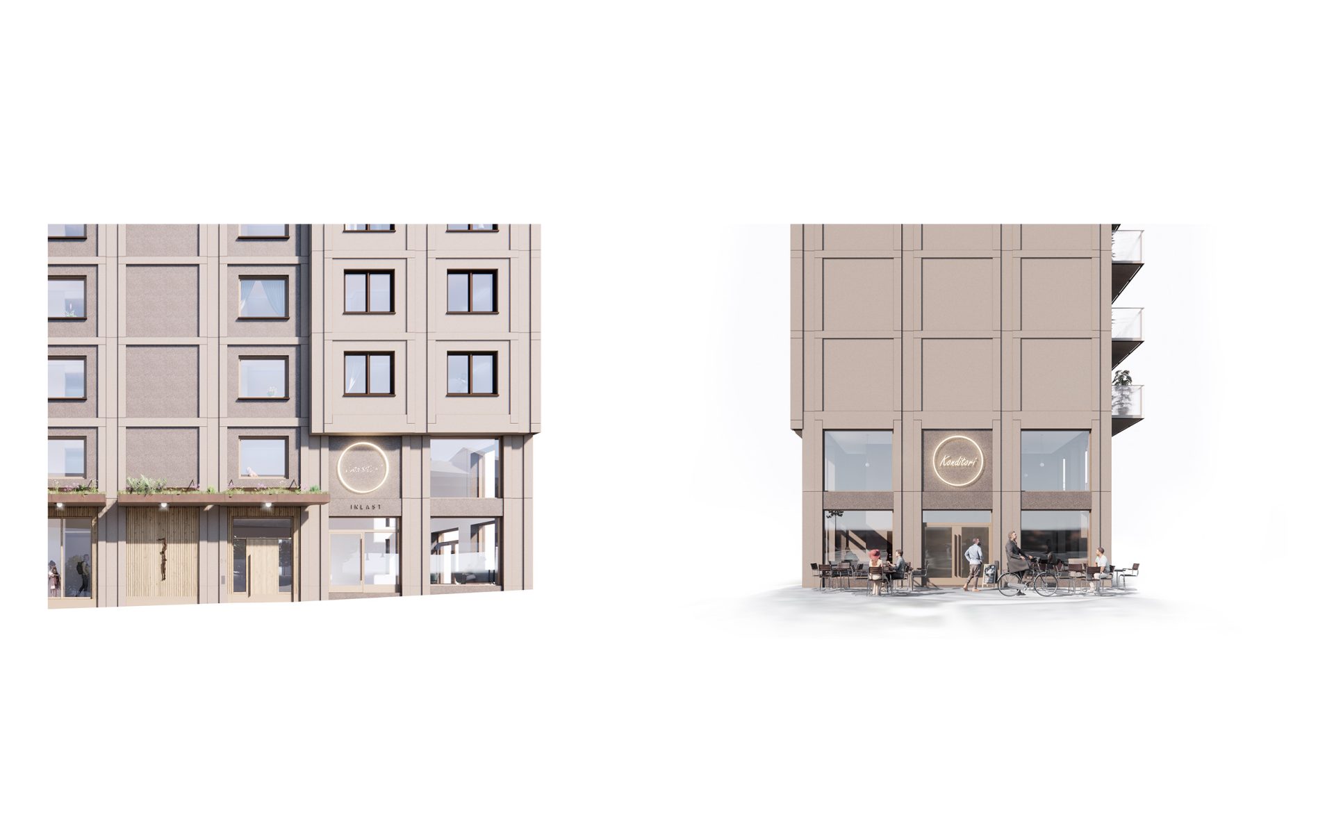Den infärgade betongen med terrakotta-toner kompletteras i sockelvåningen och detaljer med slipad betong där den mörkbruna ballasten framträder.