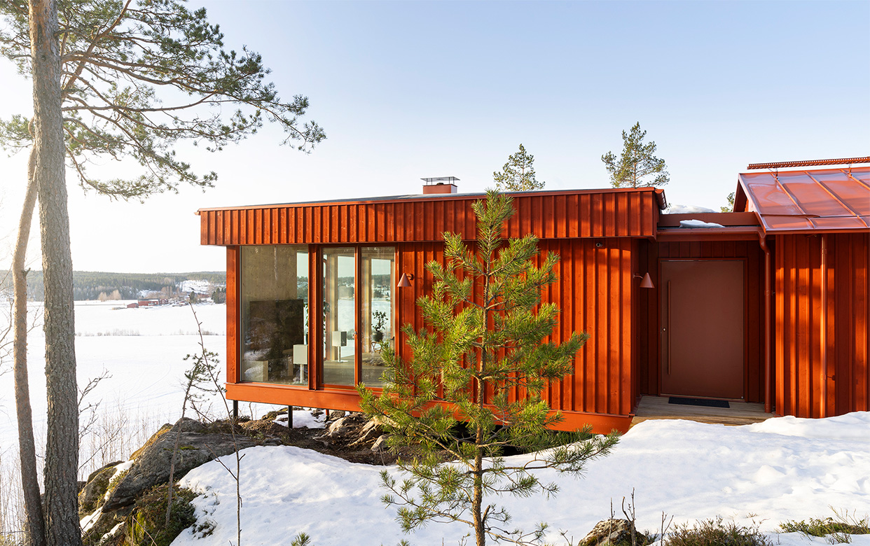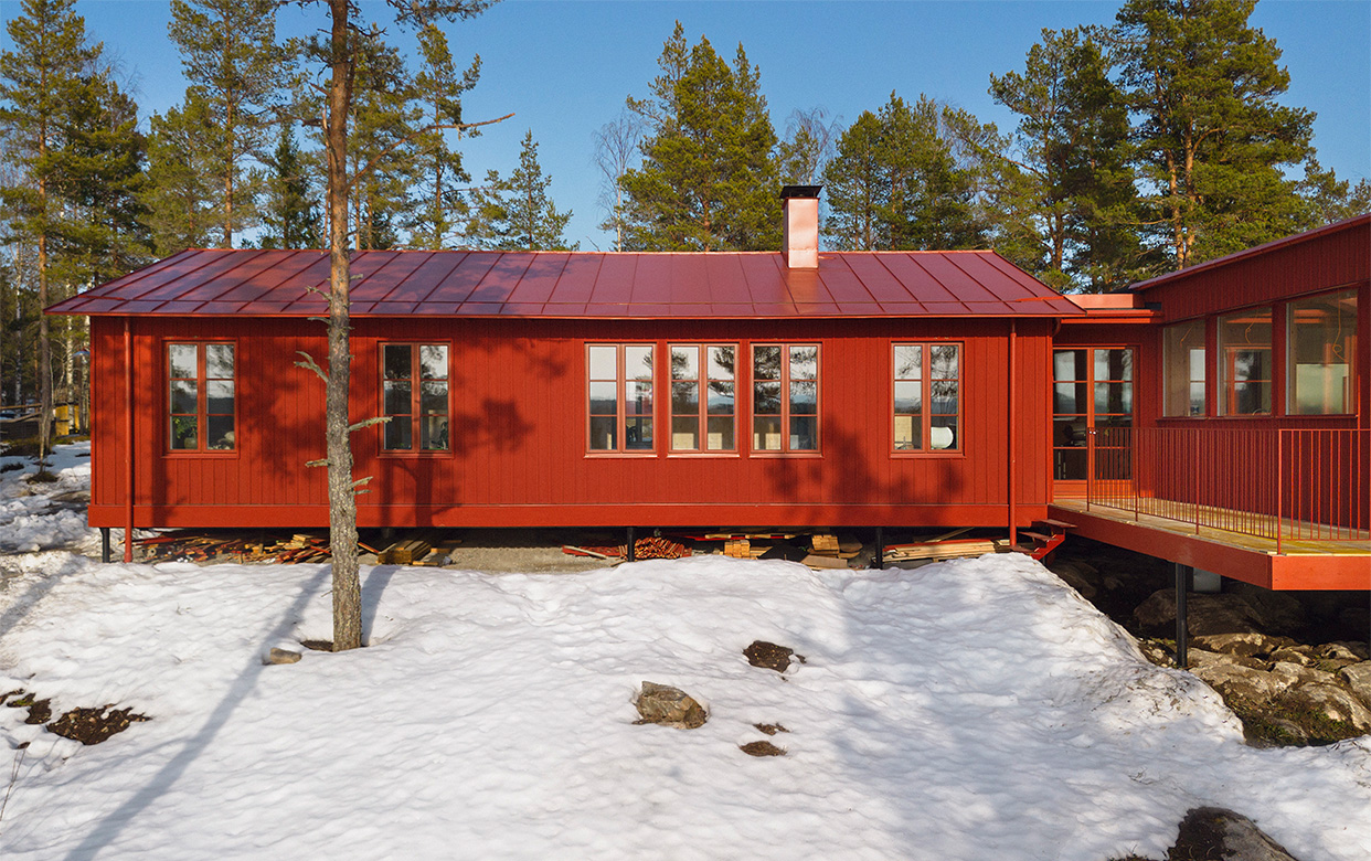 På en vacker strandtomt utanför Umeå har vi hjälpt till att ta fram ett fritidshus med stora hållbarhetsambitioner. För att sänka koldioxidavtrycket används en innovativ trästomme med träfasad, kombinerat med en betongfri grundläggning av foamglas. Huset har ritats som en L-form, men med tre utskurna hörn. I de utskurna rummen ges plats åt en entréveranda, en pergola och en utedusch med fri sikt mot havet. Skärmar med täta träribbor ger skydd och skapar skuggspel interiört och exteriört.