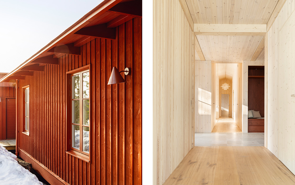 På en kuperad naturtomt i Hälsingland har vi ritat en villa i trä för en hemvändande familj. Med inspiration från den traditionella hälsingegården och modernismens raka linjer har byggnaden gestaltats i två volymer som sammanlänkas av en diskret och indragen entré. Den ena volymen rymmer de privata rummen, den andra de mer sociala och gemensamma ytorna.