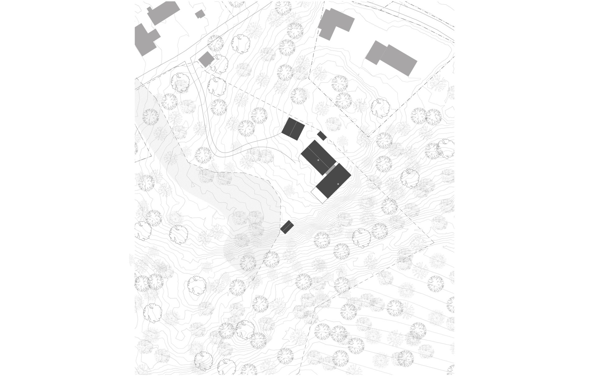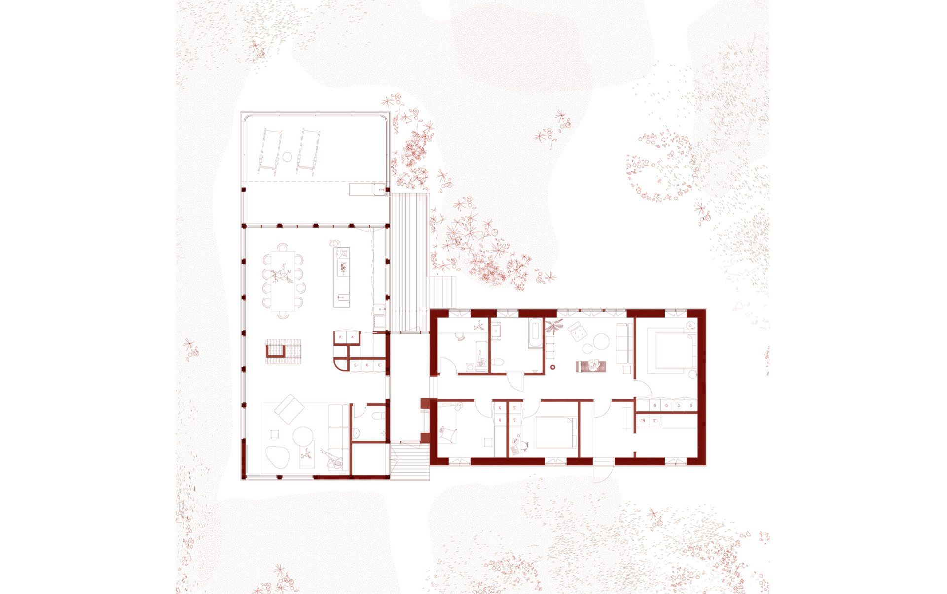 För att bevara naturtomtens karaktär och kuperade terräng är huset uppfört på stolpar vilket låter landskapet flöda fritt under byggnaden. De stora fönsterpartierna öppnar upp rummen mot den vidsträckta utsikten och volymernas placering i vinkel skapar en skyddad, intim gårdsbild på tomten.
