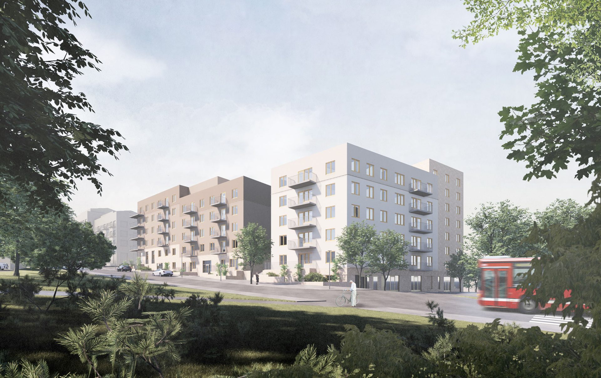 Fasaderna mot bostadsgården öppnar sig mot en skogspark. Här finns generösa balkonger med möjlighet till både storslagen utsikt och egen odling. Minst två cyklar per lägenhet ryms inom kvarteret, vilket ger fina möjligheter för cykelpendling. Bilparkering förläggs i sockeln under den gemensamma gården.