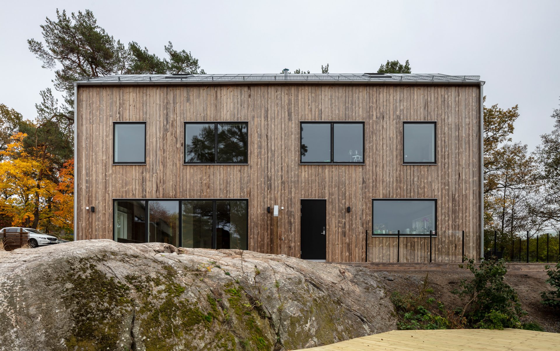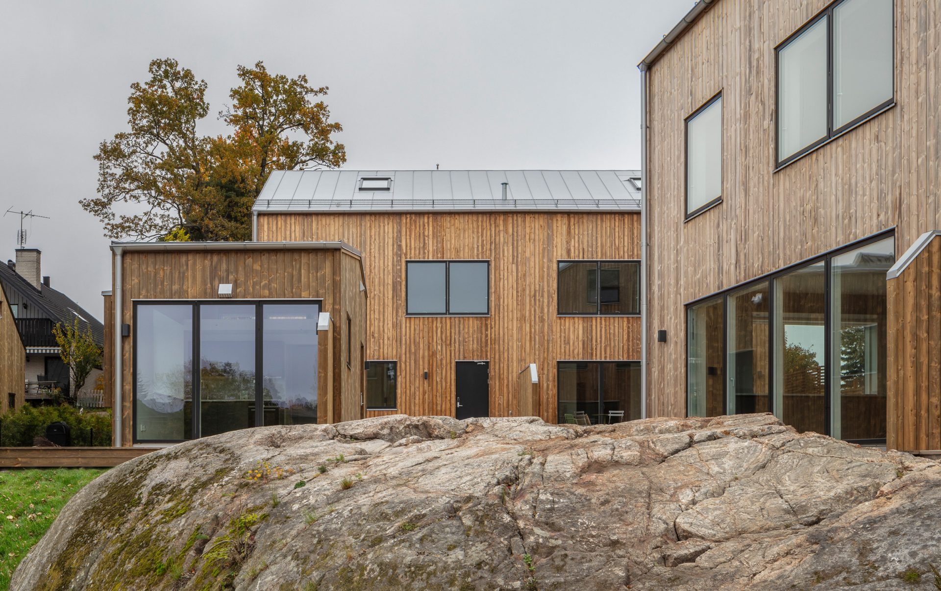 En förskola tillsammans med flera felleshus– gemensamhetshus med plats för samvaro, kultur- och föreningsverksamhet – fungerar som sociala nav i det nya området. Här skapas ett hållbart boende med skogen som trädgård.