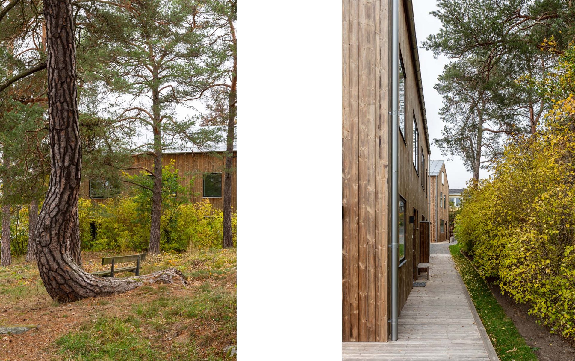 Gestaltningen tog form i en tidig idé om hur olika volymer möter stad respektive skog. Mot gatan förtätas och förtydligas gaturummet med en sammanhängande sekvens av ljusa lameller, på höjden mot skogen tre fristående punkthus med tydlig vertikalitet i en mörkare färgskala.