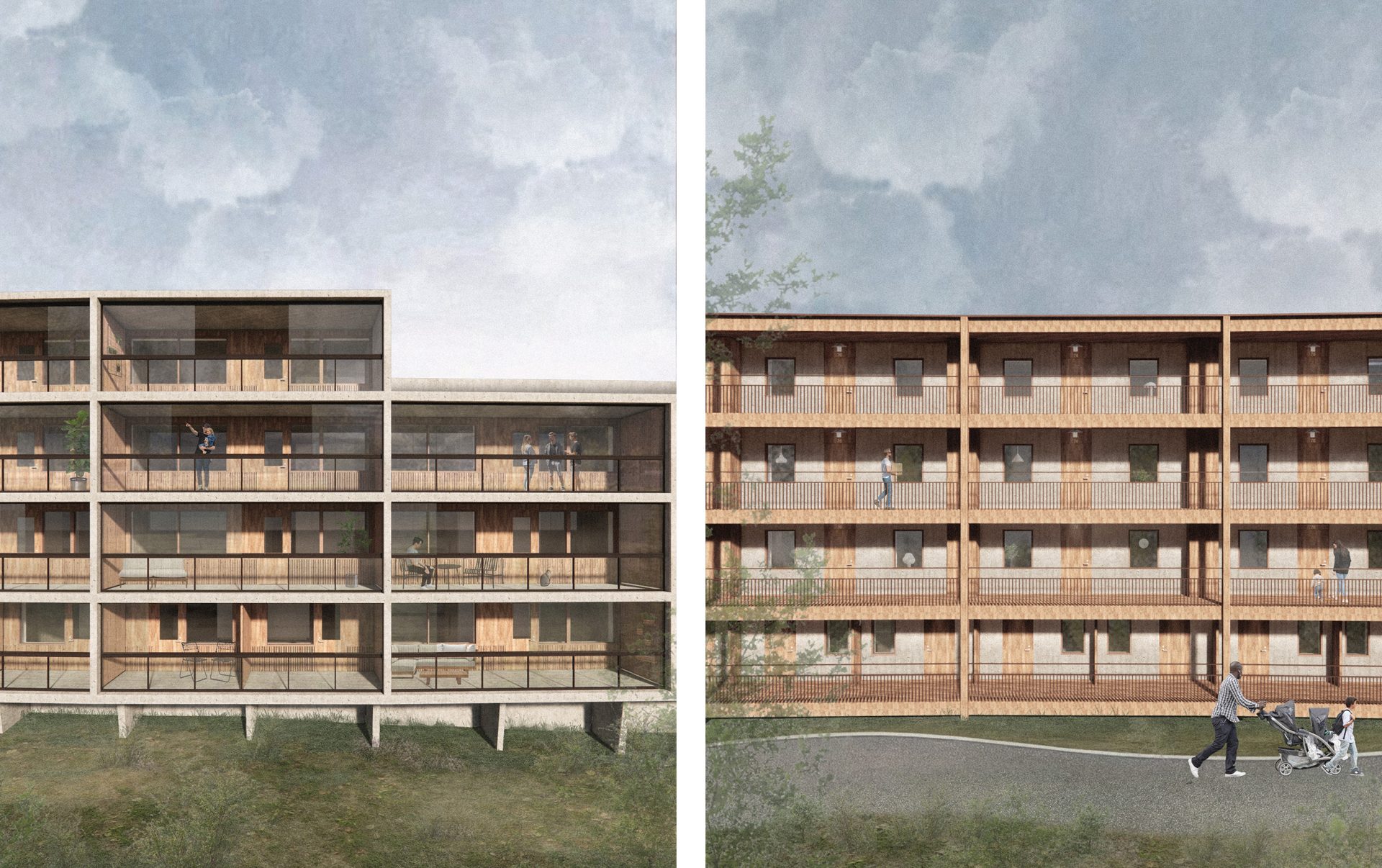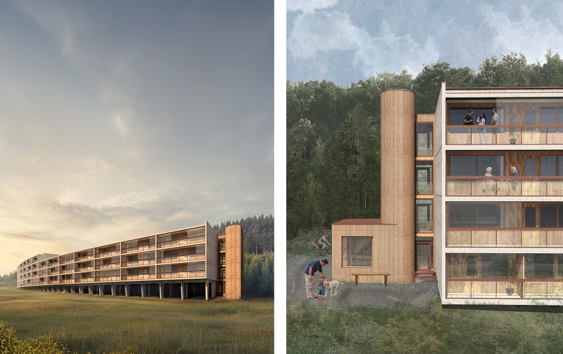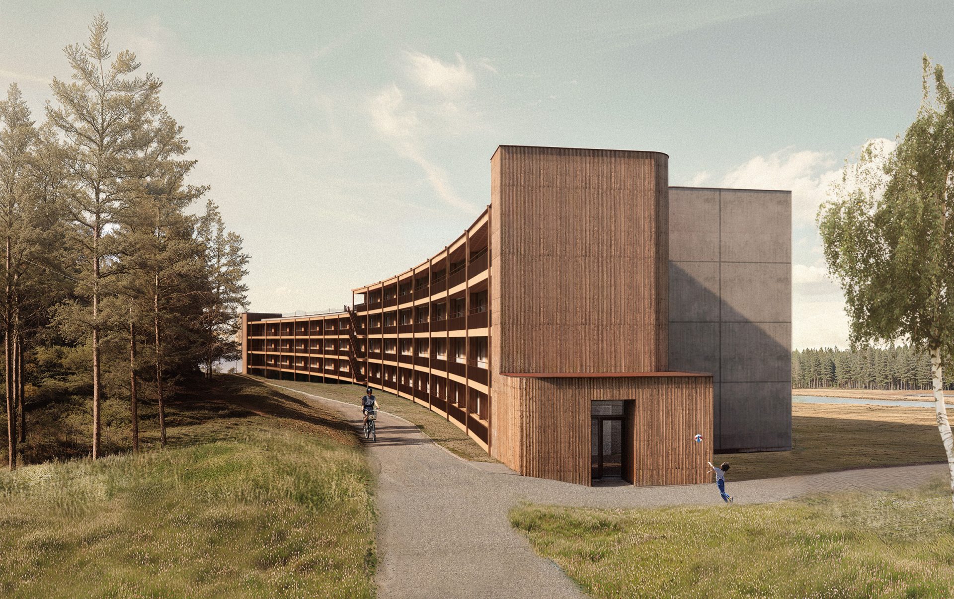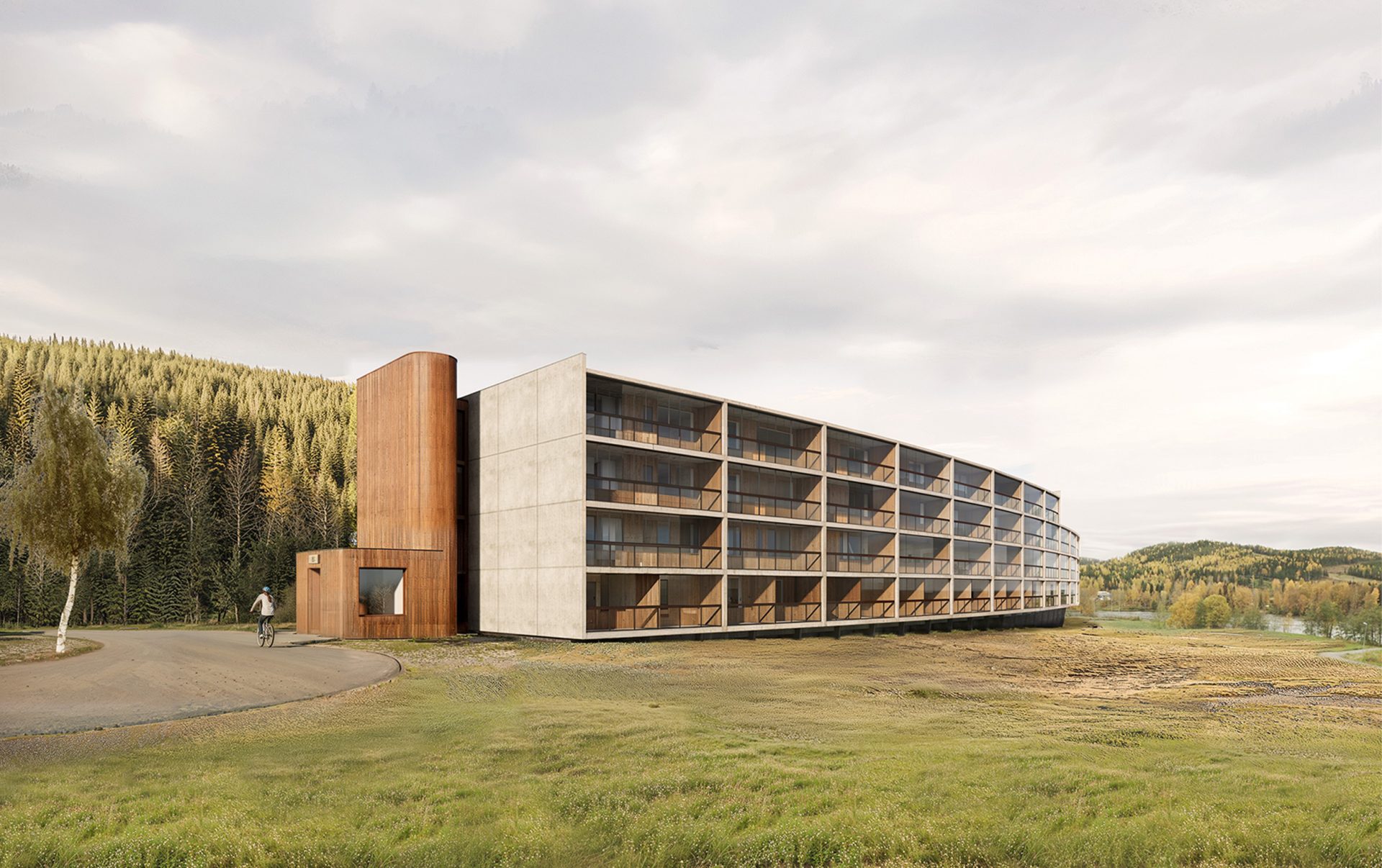 Berghuset är placerat längs Hembergets fot i Vännäsby en bit från Umeå. Platsen har en tydlig tvåsidighet med en skogsslänt åt ena hållet och öppen åkermark med älven åt det andra. Det vidsträckta flerbostadshuset har en lätt krökning som följer bergets form och varierar i tre till fyra våningar. Strukturen angörs via trapphus i varje ände och en sammankopplande entrébalkong på husets baksida. Bostäderna riktar sig söderut, mot Middagsberget och vattnet, med generösa ljusinsläpp och inglasade balkonger.