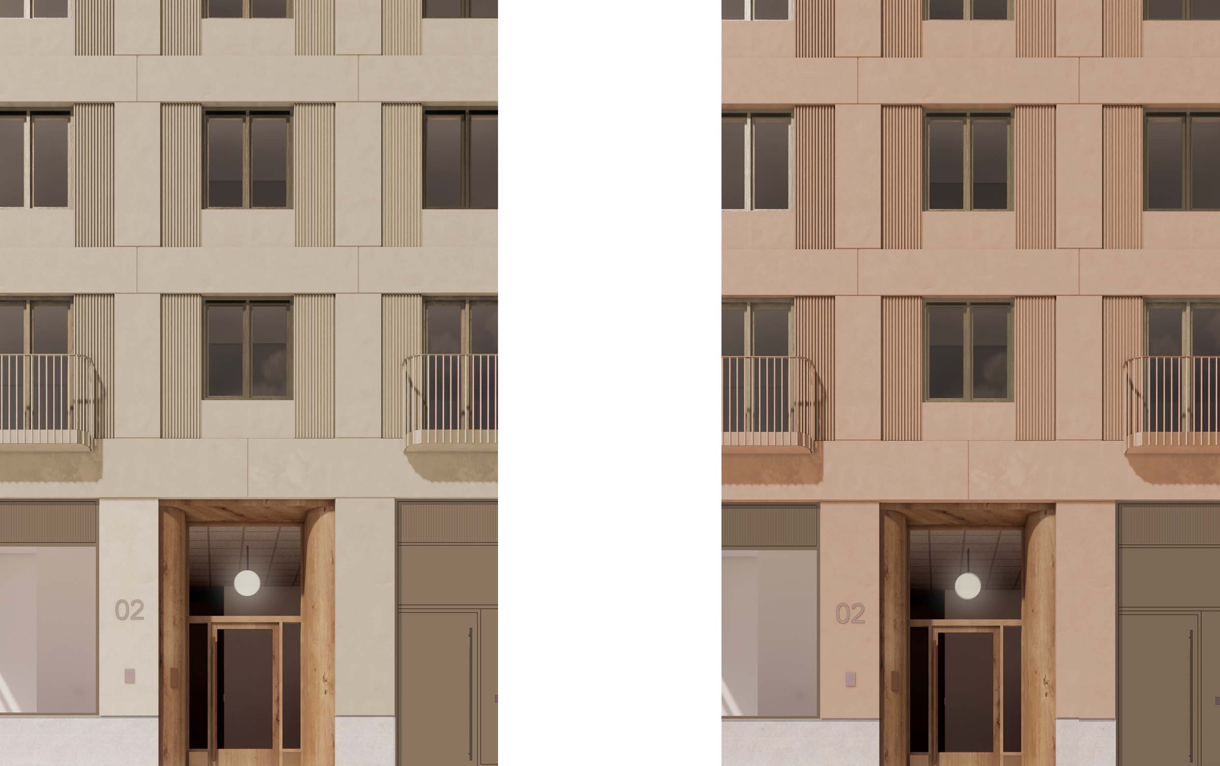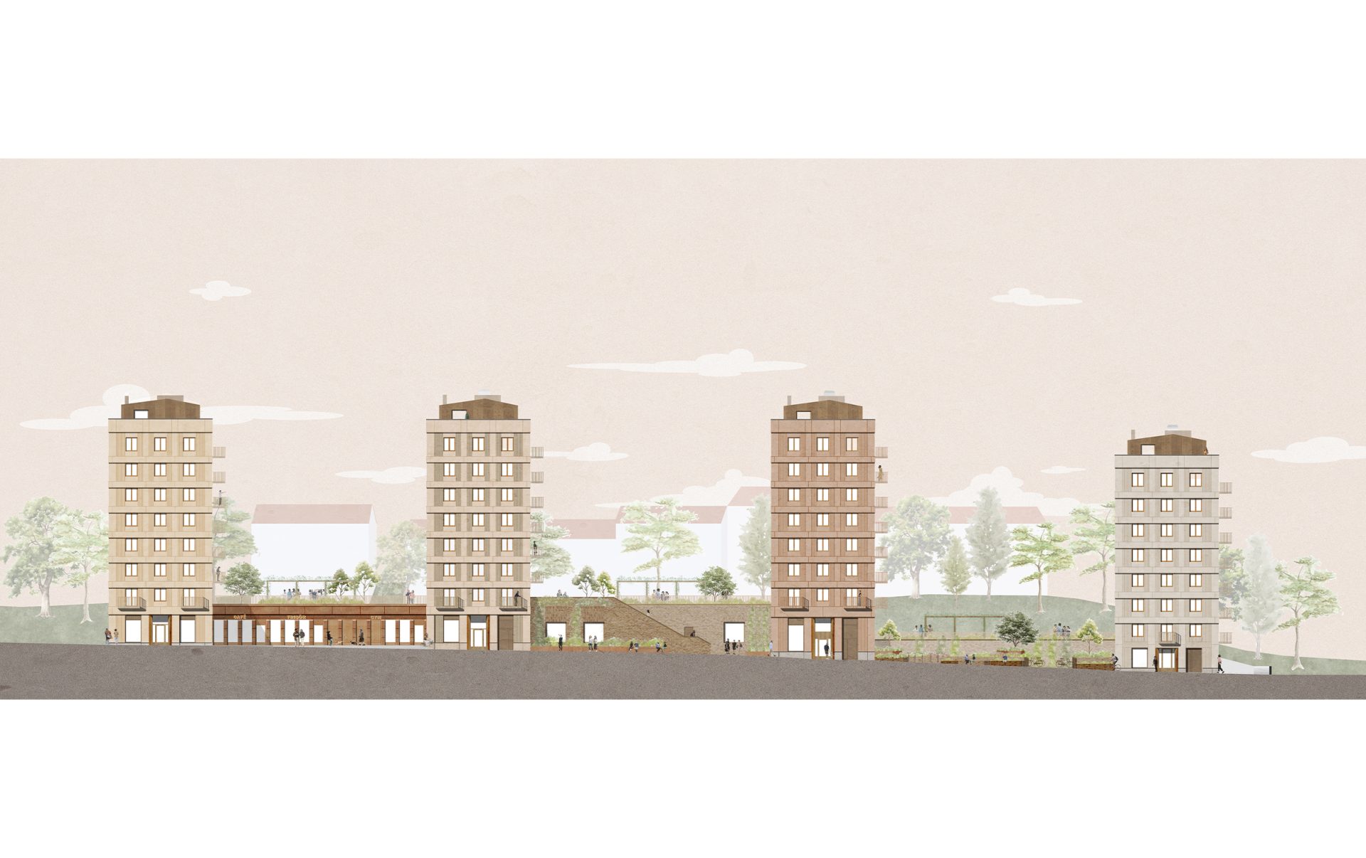 De smala punkthusen skapar stora mellanrum med generösa öppna bostadsgårdar och maximerar samtidigt ett bevarande av utsikten för befintlig bebyggelse. Vägens krökta form, husens växlande höjder, och sockelvåningens skiftande karaktär och innehåll ger en varierad upplevelse under rörelsen längs gatan. Punkthusens fasader gestaltas med ett muralt ramverk med fyllningar och fönsterpartier. Byggnaderna har generösa indragna entréer och glasade cykelrum eller lokaler mot gatan. De slanka volymerna artikuleras genom att den anslutande sockelbyggnaden dras in från gatan. Bottenvåningen gestaltas omsorgsfullt i material och detalj. Mellan punkthusen finns planteringar och grönska som bidrar till gaturummet, och en våning upp annonserar sig bostadsgårdarna. Markbostädernas entréer och uteplatser avgränsas från gatan med växtlighet och låga murpartier.