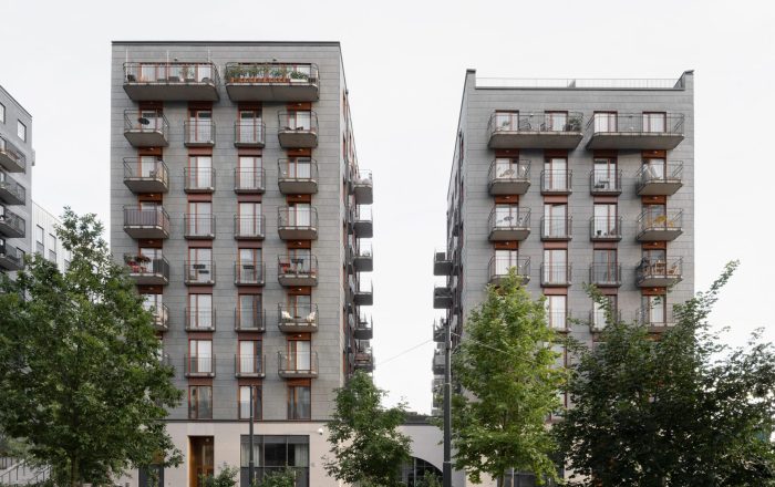 En hållbar stadsdel med öppna stadsrum och kompakta byggnader med utblickar.