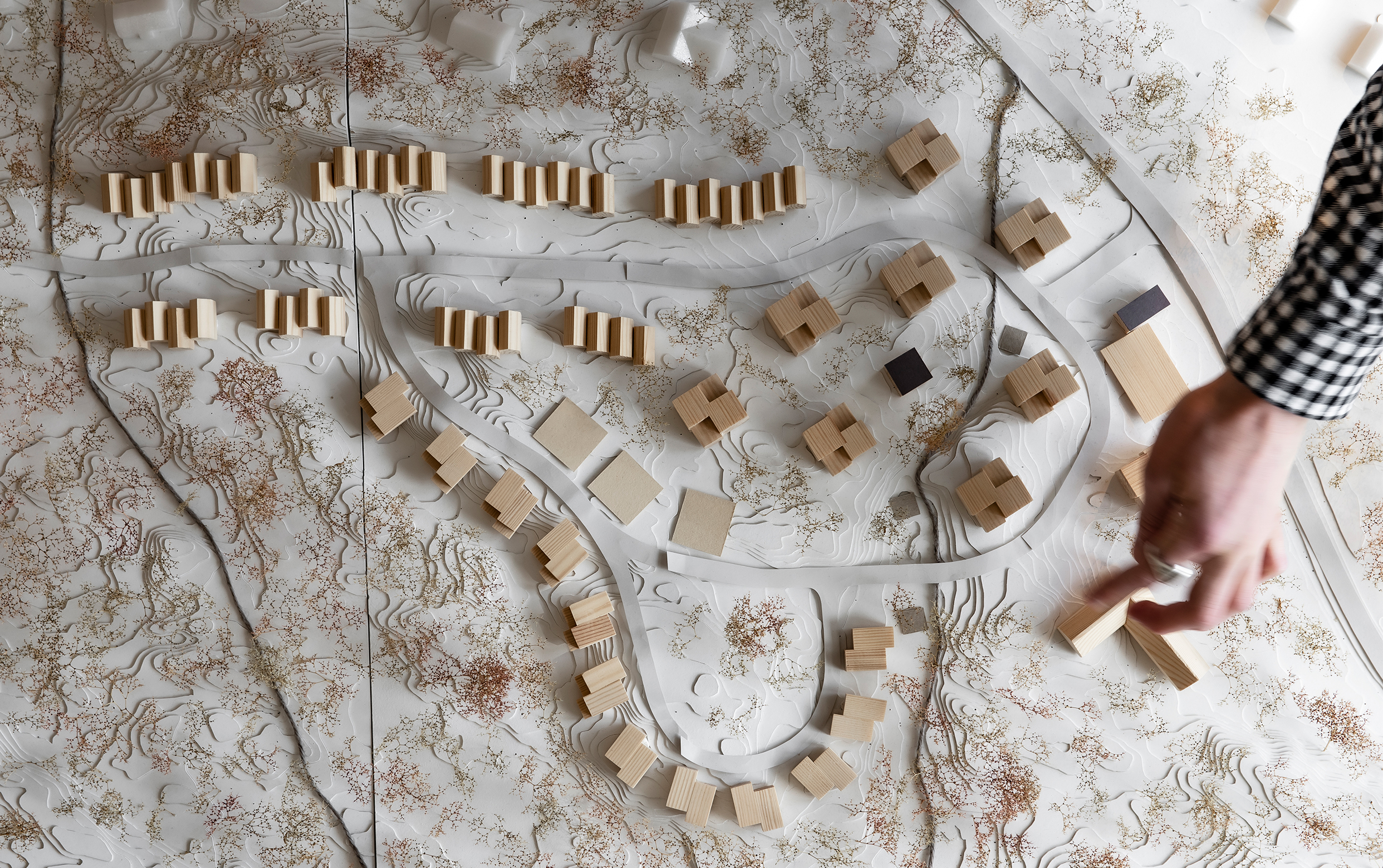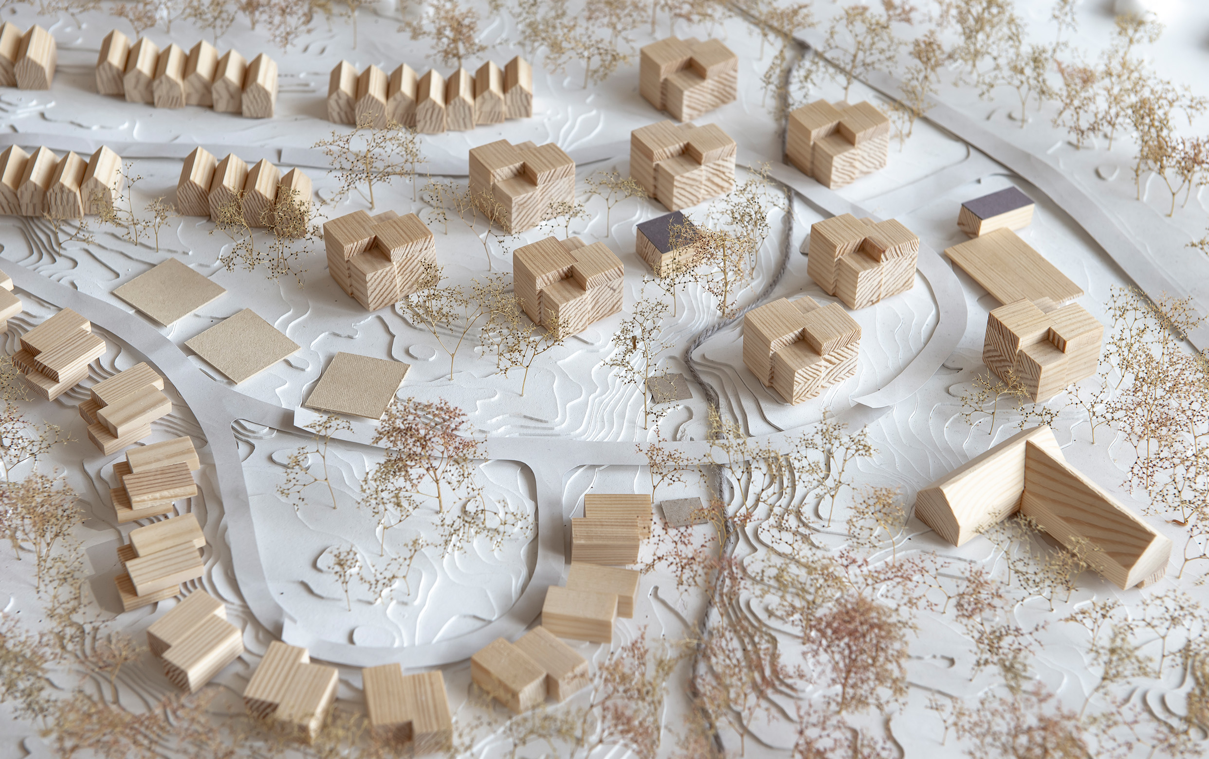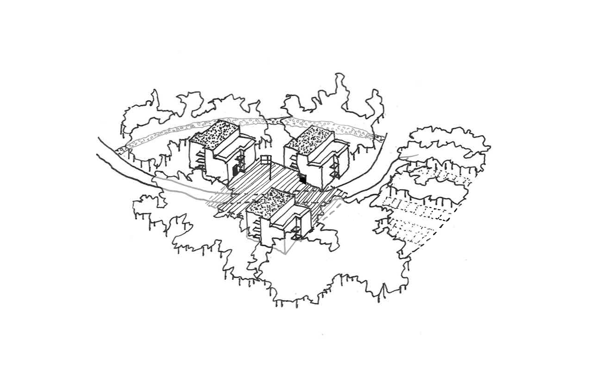 En förskola tillsammans med flera felleshus– gemensamhetshus med plats för samvaro, kultur- och föreningsverksamhet – fungerar som sociala nav i det nya området. Här skapas ett hållbart boende med skogen som trädgård.